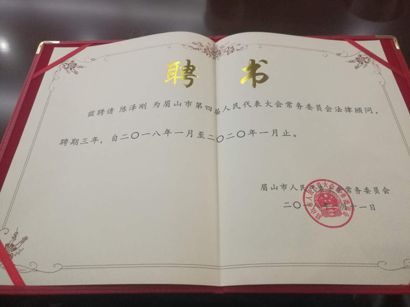 4月25日,眉山市第四届人民代表大会常务委员会举行第十三次会议。会议上举行了常年法律顾问聘任仪式,聘请陈泽刚等6名律师担任市人大常委会法律顾问 。