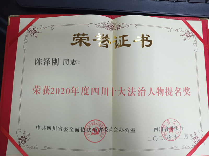 12月2日,2020年四川省“宪法宣传周”启动仪式在成都举行。活动现场揭晓了2020年度“四川十大法治人物”“四川十大法治人物提名奖”名单。四川达宽律师事务所党支部书记、主任陈泽刚获得“四川十大法治人物提名奖”