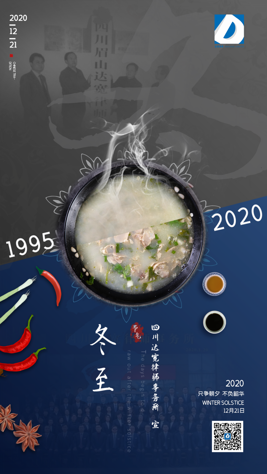 1998年12月22日,正是冬至,寒风凛冽,在环湖路一幢民房里,时任办事处主任的吕勇拿着仅有的5毛钱对大家说,“今天是冬至,可是我周身就只有5毛钱,要不大家买份报纸看看,喝西北风,就当过冬至了。”就在那个绝望的冬至下午,陈泽刚主任从仁寿赶到眉山,叫上吕勇和当时的团队成员,大家一起讨论了律所的发展和眉山业务开展,最困难时就是离成功最近的时候,越困难越要坚守。 “今天冬至,我请大家吃羊肉!这顿羊肉汤,吃出信心,吃出希望。”以后,就形成了惯例,每年冬至,达宽律师家人都要一起过冬至,一起吃羊肉。