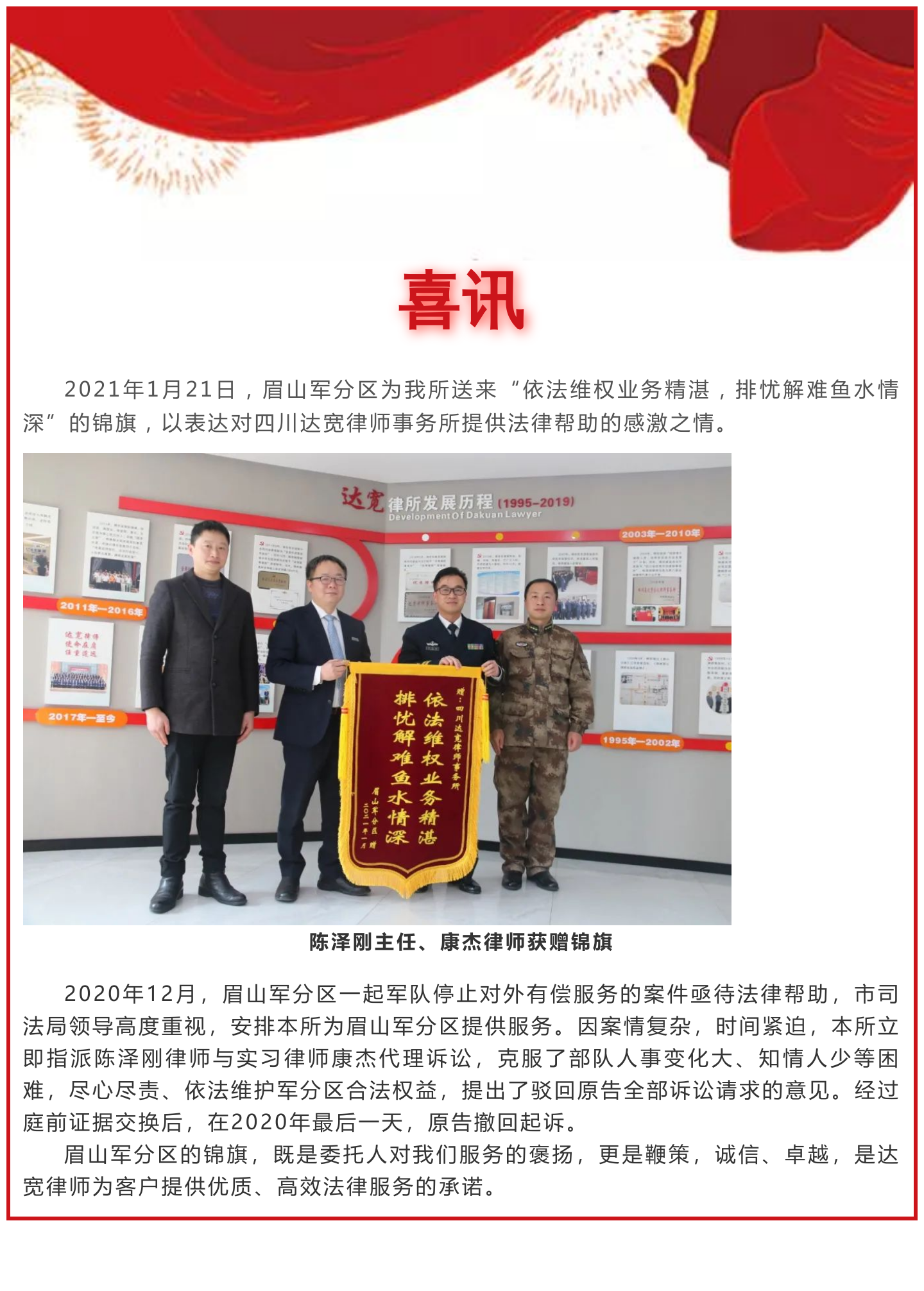 “依法维权业务精湛 排忧解难鱼水情深”—我所陈泽刚主任、康杰律师获赠锦旗