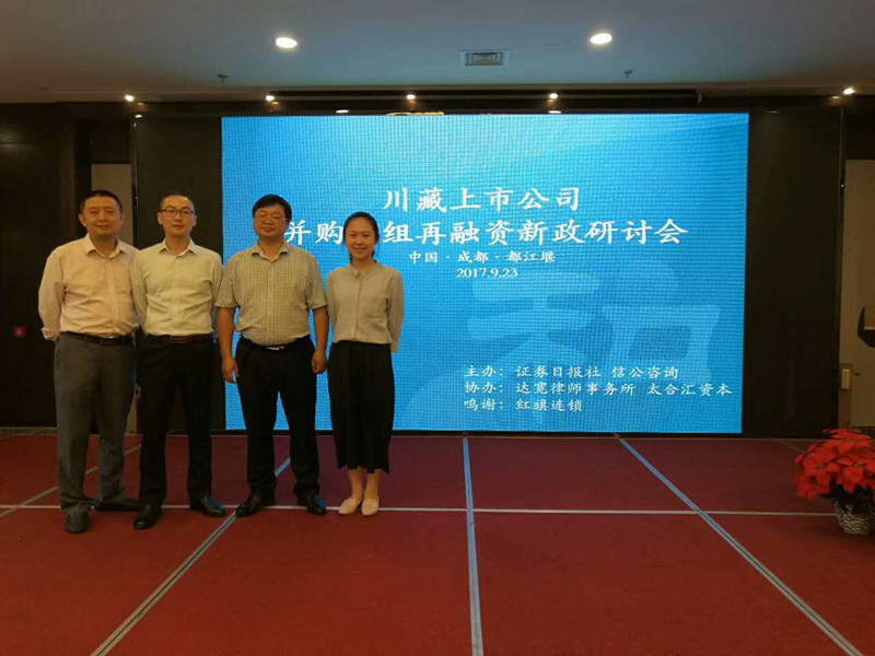 9月23日,由证券日报社、信公咨询主办,四川达宽律师事务所协办的川藏上市公司并购重组再融资新政研讨会在成都市都江堰顺利举行。此次会议邀请了四川、西藏的众多上市公司。本所执行主任吕勇、高级合伙人林炜诚、蒋国安参加了会议。