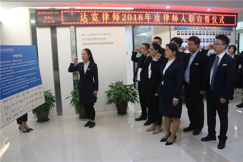 四川达宽律师事务所新入职律师的宣誓,也是达宽文化重要的组成部分,颁发纪念品和合影留念结束后,新入职的律师便由四川达宽律师事务所成都分所胡皓月律师领头,举拳宣读律师誓词。宣誓代表着从此刻起,正式成为达宽大家庭的一员,成为达宽大家庭的家眷;代表着将此生的青春和热血,奉献于忠于《宪法》,忠于追求公平正义;也代表着一心伴同达宽前行,奋力共创达宽美好明天。