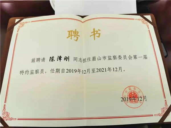 12月6日,眉山市监察委员会召开第一届特约监察员聘请会议,我所主任、党支部书记陈泽刚律师等15人被选聘为第一届特约监察员,会议由市纪委副书记、市监委副主任俞红梅主持,市委常委、市纪委书记、市监委主任张力向特约监察员颁发了聘书并作了重要讲话。