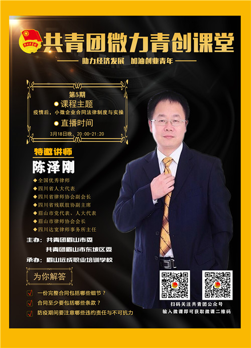 为助力经济发展,加油创业青年,3月19日晚上,由共青团市委、共青团眉山市东坡区委主办,眉山远成职业培训学校承办的共青团微力青创课堂在四川达宽律师事务所开展,本次活动邀请律师为我所主任陈泽刚,并以视频直播的方式展开,课程主题为《企业合同法律制度与实操》,扫描下方二维码便可观看视频回放。